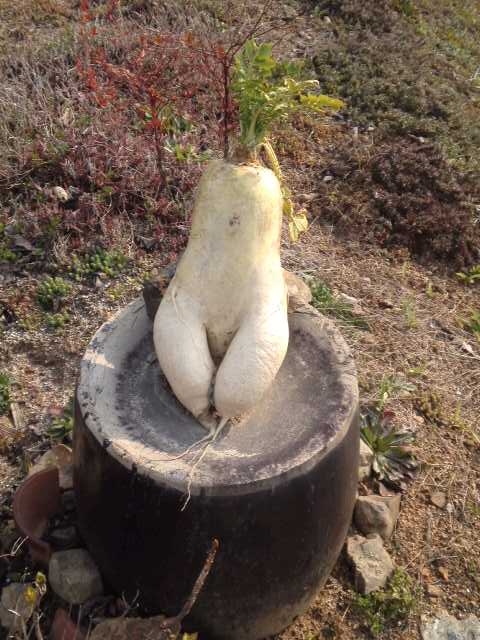 ひっこ抜いたらこんなお大根で、びっくりして笑ったんでしょうねー